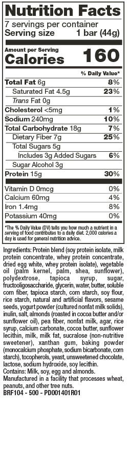 Mélange protéique (isolat de protéine de soja, concentré de protéine de lait, concentré de protéine de lactosérum, isolat de protéine de lactosérum), isomalto-oligosaccharide, huile végétale (huile de palmiste, huile de palme, huile de karité, huile de tournesol), amidon de tapioca, polydextrose, glycérine, sucre, sucre inverti biologique, beurre, eau, amidon de maïs, farine de soja, arômes naturels et artificiels (arachides), graines de sésame, poudre de yogourt (culture de matières sèches de lait sans gras), inuline, sel, poudre d’albumen d’œuf, amandes rôties, carbonate de calcium, substances laitières, fibre de pois, agar, extrait de vanille, sirop de riz, beurre de cacao, lécithine de soja, sucralose (contient 12 mg par portion), gomme xanthane, phosphate monocalcique, bicarbonate de sodium, tocophérols, levure, chocolat non sucré, lactose, hydroxyde de sodium.
