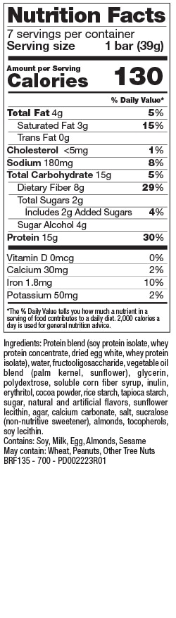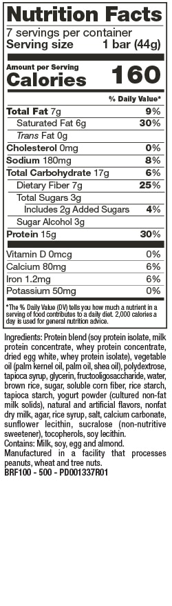 Mélange protéique (isolat de protéine de soja, concentré de protéine de lait, concentré de protéine de lactosérum, isolat de protéine de lactosérum, poudre d’albumen d’œuf), isomaltooligosaccharide, huile végétale (huile de palmiste, huile de palme, huile de karité), polydextrose (contient 4,5 g par portion), amidon de tapioca, glycérine, sucre inverti, riz croustillant (riz brun, sirop de riz, sel), eau, poudre de yogourt (culture de solides de lait sans gras), arômes naturels et artificiels (arachides et amandes), carbonate de calcium, poudre de lait écrémé, agar, sel, lécithine de soja, sucralose (contient 12 mg par portion), extrait de vanille, tocophérols.