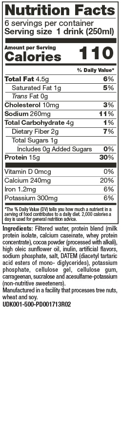 Eau filtrée, mélange protéique (isolat de protéine de lait, caséinate de calcium, concentré de protéine de lactosérum), poudre de cacao, huile de tournesol à haute teneur oléique, inuline, arômes artificiels, phosphates de sodium, sel, esters tartriques de mono et diglycérides acétylés (DATEM), phosphate de potassium, cellulose microcristalline, carboxyméthylcellulose sodique, carraghénine, sucralose (34 mg par portion de 250 mL), acésulfame-potassium (26 mg par portion de 250 mL).