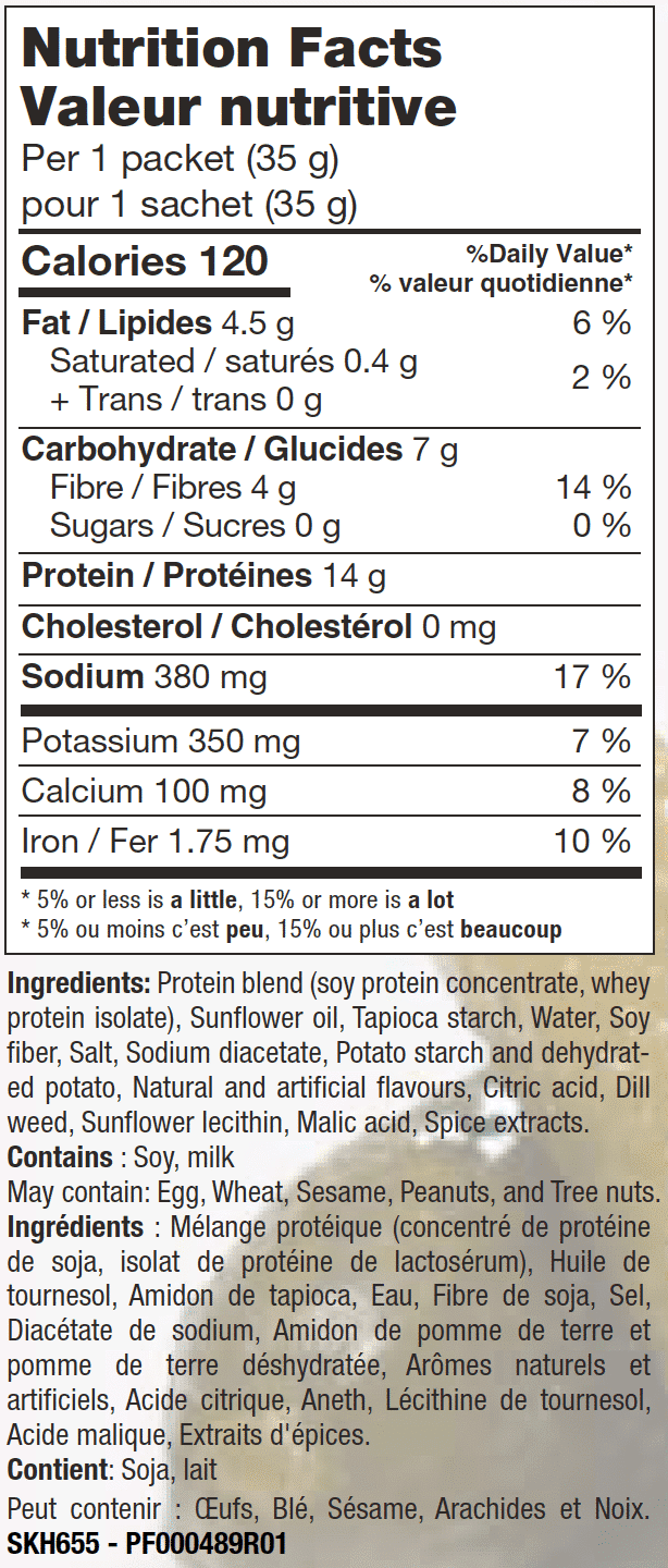 Valeur nutritivePer 1 packet (35 g) pour 1 sachet (35 g) Calories 120 %Daily Value* % valeur quotidienne* Fat / Lipides 4.5 g 6 % Saturated / saturés 0.4 g 2 % + Trans / trans 0 g Carbohydrate / Glucides 7 g Fibre / Fibres 4 g 14 % Sugars / Sucres 0 g 0 % Protein / Protéines 14 g Cholesterol / Cholestérol 0 mg Sodium 380 mg 17 % Potassium 350 mg 7 % Calcium 100 mg 8 % Iron / Fer 1.75 mg 10 % * 5% or less is a little, 15% or more is a lot * 5% ou moins c’est peu, 15% ou plus c’est beaucoup |