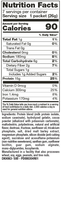 Mélange protéique (isolat de protéine de lait, caséinate de sodium), gélatine hydrolysée, poudre de cacao, maltodextrine, arômes naturels et artificiels, polydextrose (contient 0.7g par portion), huile de tournesol, dextrose, fructose, sel, phosphate tricalcique, phosphate de magnésium, extrait de malt (blé), bioxyde de silicium, gomme de xanthane, sucralose, lécithine de soja, acésulfame-potassi- um, gomme de guar, alginate de sodium, mono et diglycérides, tocophérols. Contient 40 mg de sucralose et 17 mg d’acésul- fame-potassium par portion.